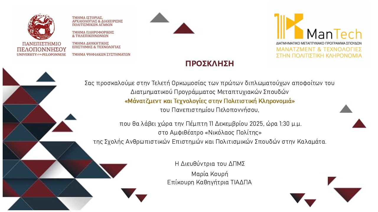 Επισυναπτόμενα Αρχεία Πρόσκληση Ορκωμοσία ΤΙΑΔΠΑ ΔΕΚΕΜΒΡΙΟΣ 2025.docx Πρόσκληση ΠΜΣ ΝΣΙ.docx ΠΡΟΣΚΛΗΣΗ MANTECH ΟΡΚΩΜΟΣΙΑ.jpg